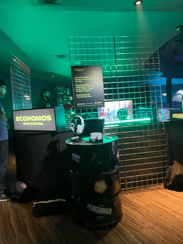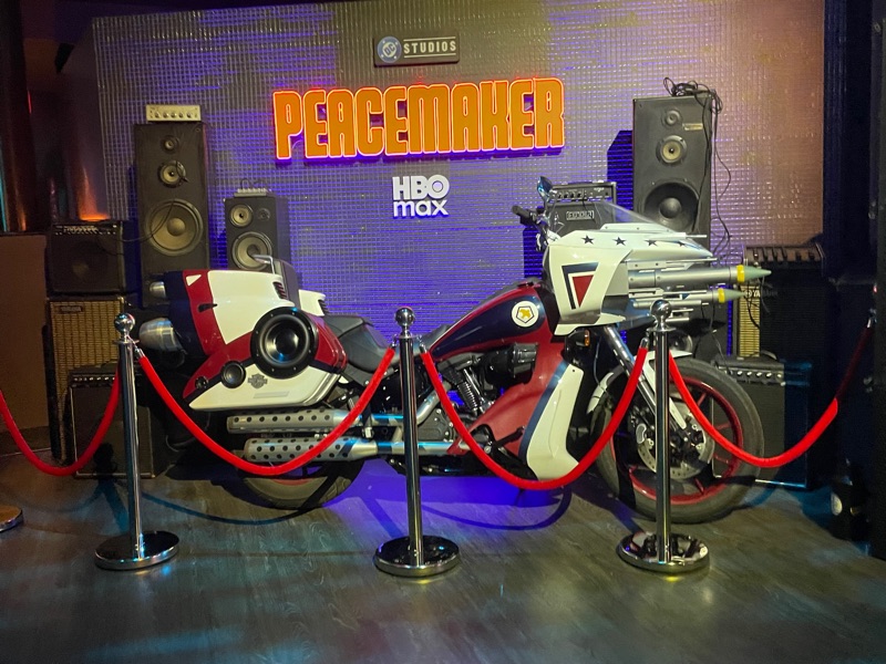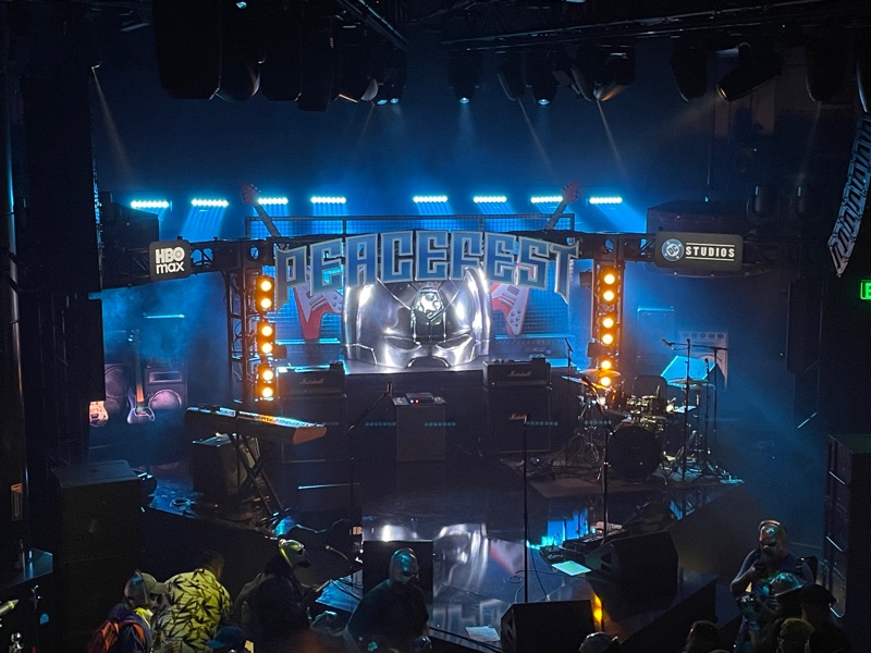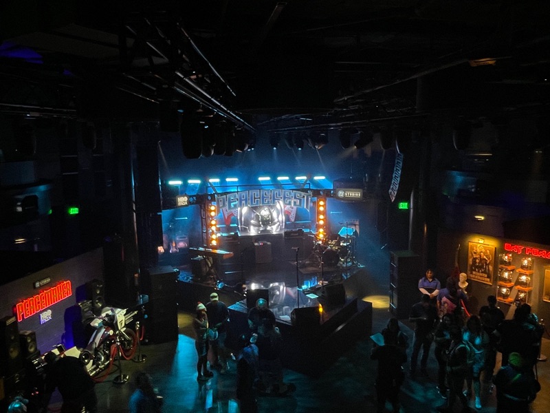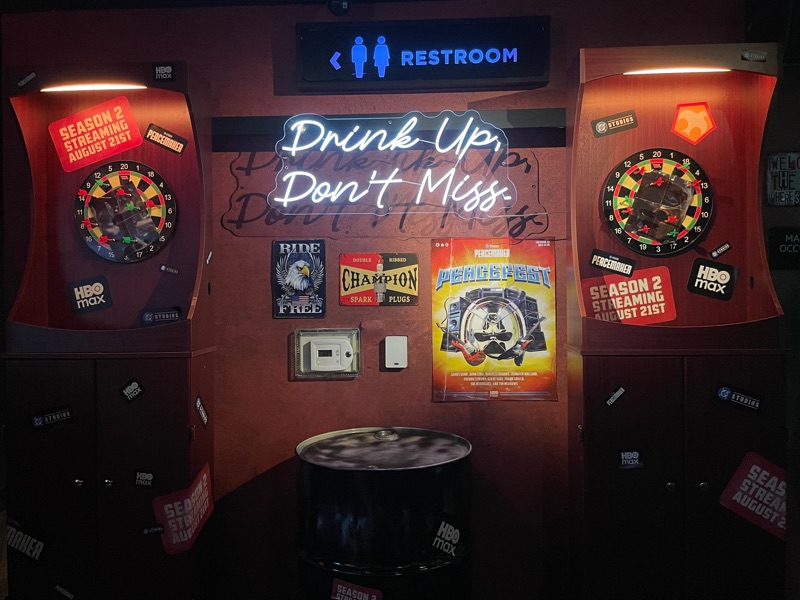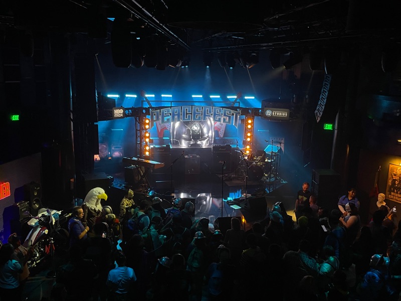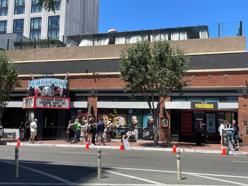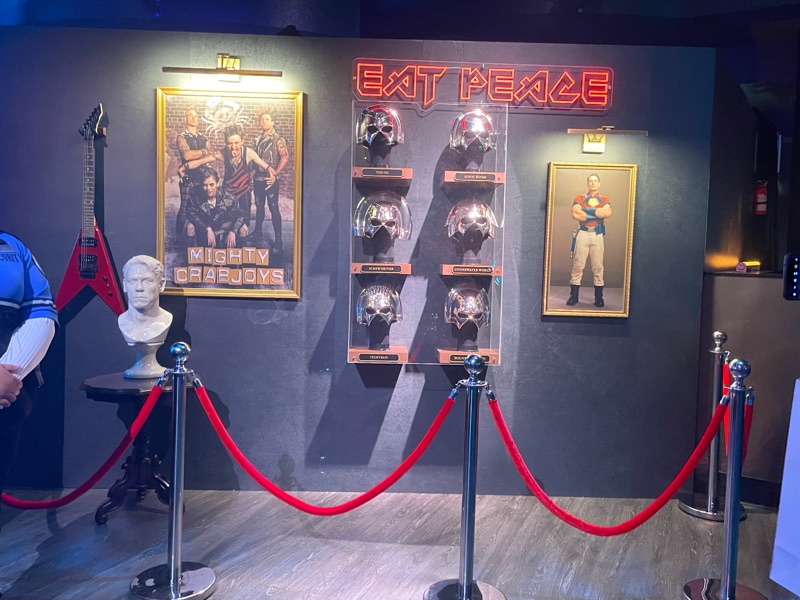 The reservation system for this offsite before comic con didn't go very well as the website kept crashing but we can overlook that because the pain and suffering of wasting a day trying to get a reservation paid off big time. Once we arrived for our time slot, we were given a Peacefest bandana and a Peacemaker mask. We had unlimited drinks and got to see some of the Peacemaker props from the show as well as purchase exclusive Peacemaker merch. Upstairs was the bar and an area to play video games featuring none other than Peacemaker himself battling it out with anyone else from other shows or games. We got treated to a concert featuring a live band playing 80's Hair Metal music such as Guns 'n Roses' "Welcome to the Jungle", Def Leppard's "Pour Some Sugar On Me" to Bon Jovi's "Livin' on a Prayer". The live concert lasted about 20 minutes with the whole experience lasting over 30+ minutes.
