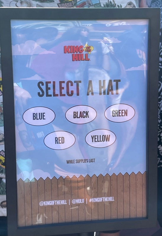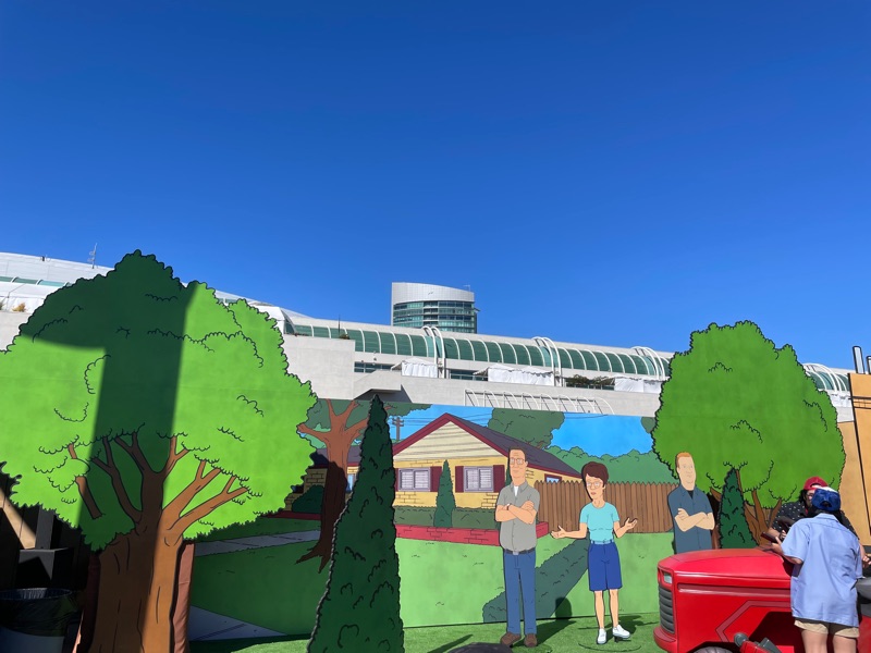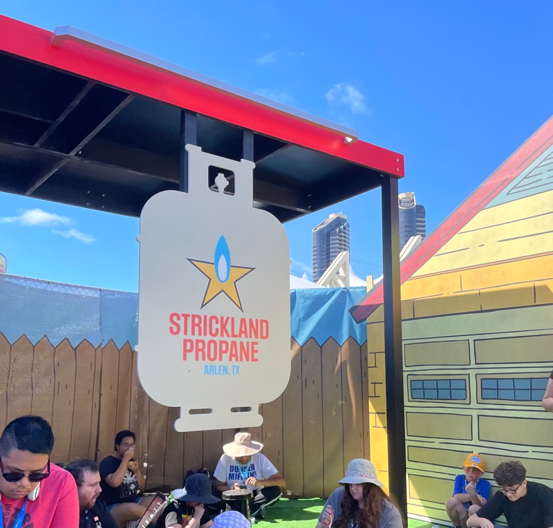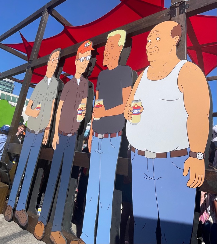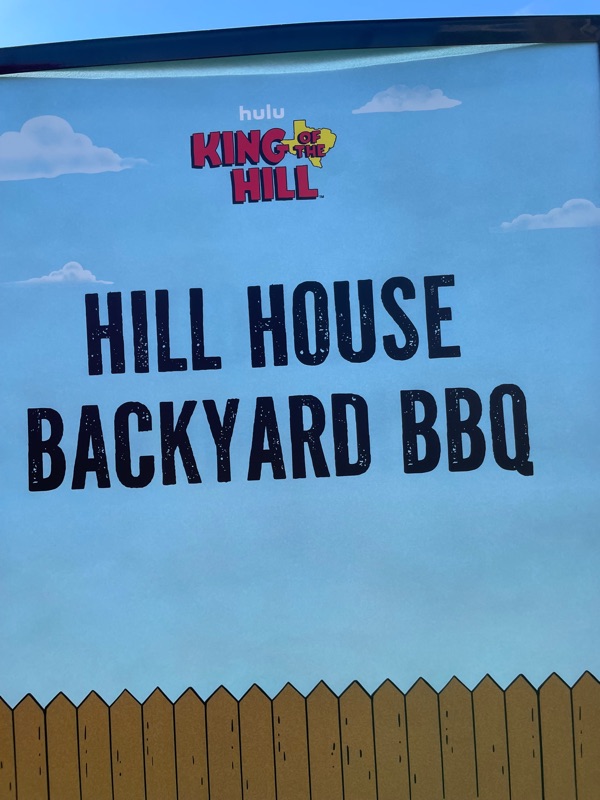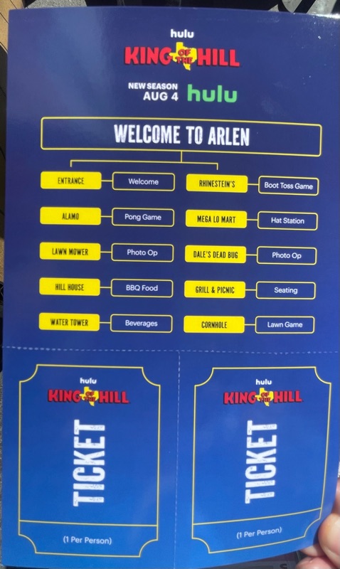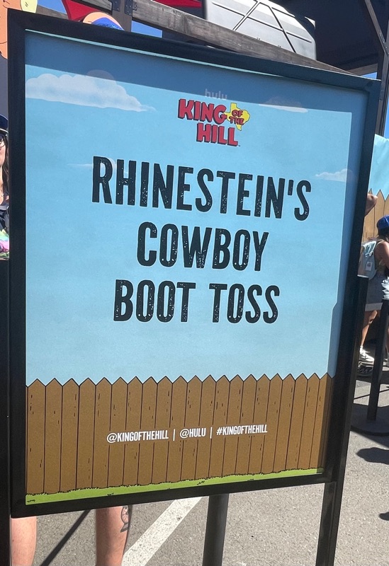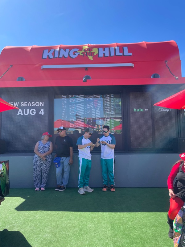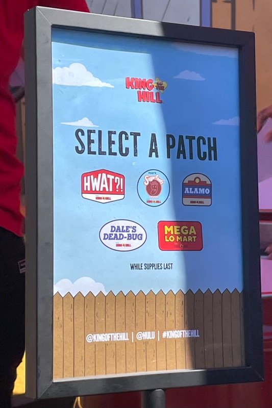 Hulu’s King of the Hill offsite activation during SDCC was a really fun and unique experience. Once you get through the line you are given a King of the Hill card that tells you what activities there are inside Arlen, Texas as well as tickets for a trucker hat and bbq food. There were various photo ops as well as several games to win prizes such as a can koozie, pin sets etc.... Pick up your trucker hat at Mega Lo Mart, food at the Hill House Backyard BBQ and stop at the Water Tower to pick up your can of Alamo water.