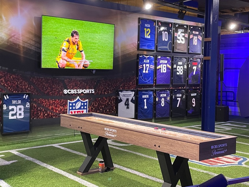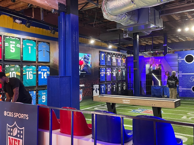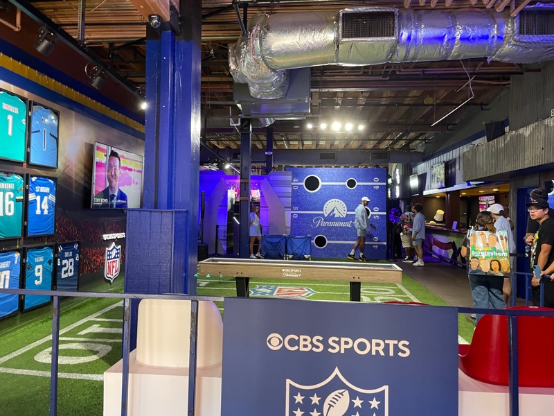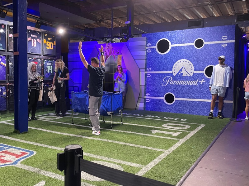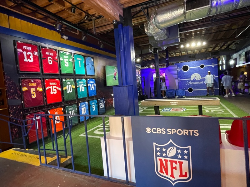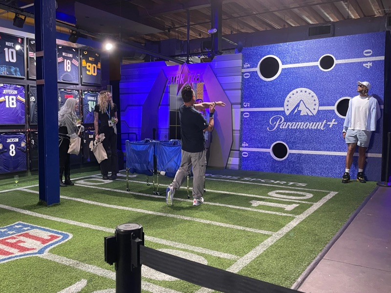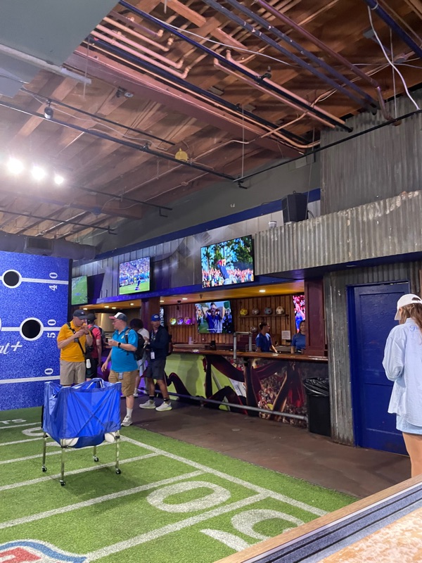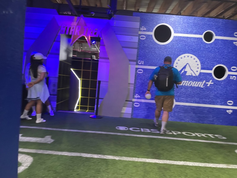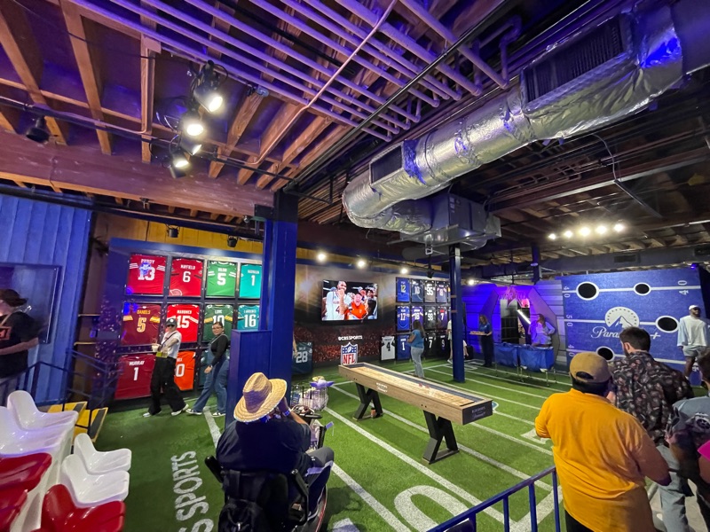 This area was decked out as a chill sports bar. They had a TVs set up, bleacher seats, shuffleboard, NFL Jerseys on the wall, a bar, turf and an area to throw a football through one of the holes. Overall it was nice chill area to relax. See pics below:
