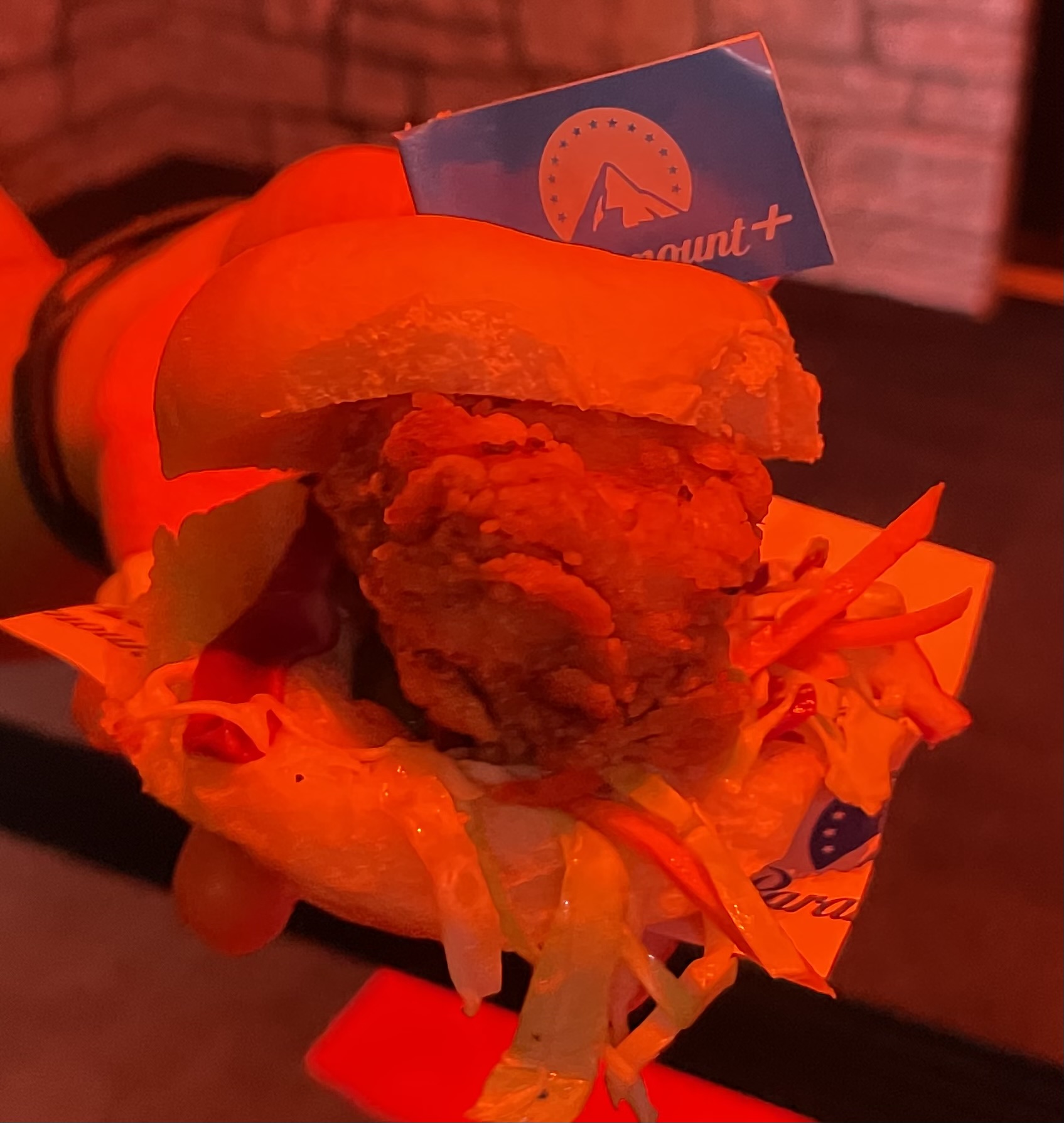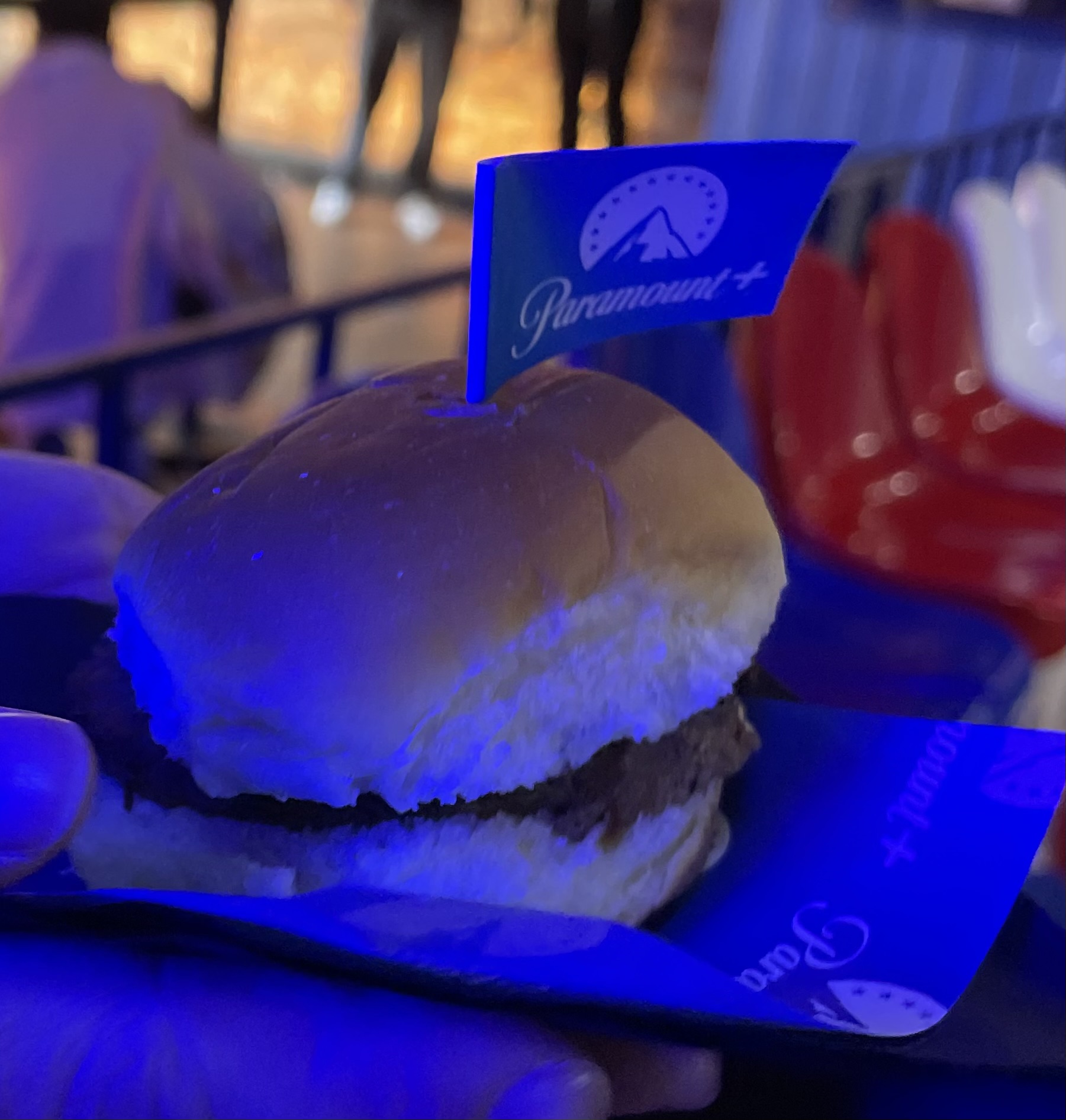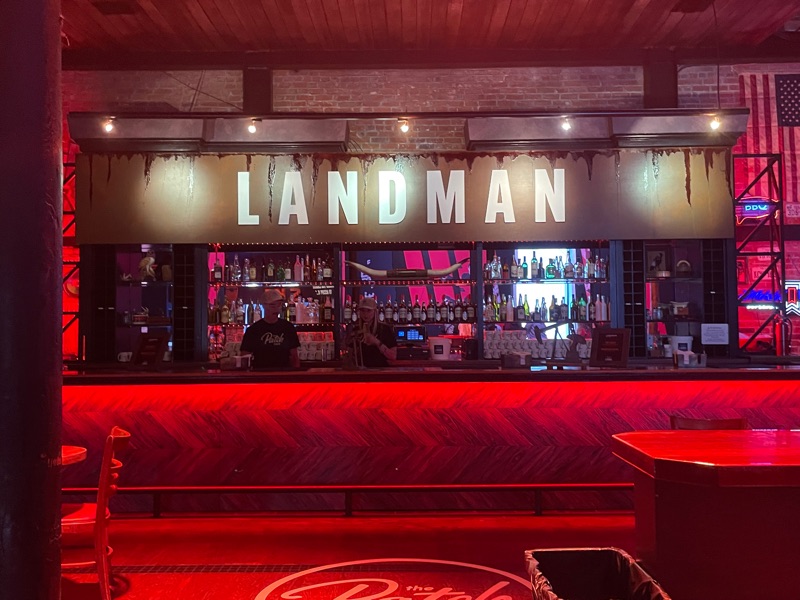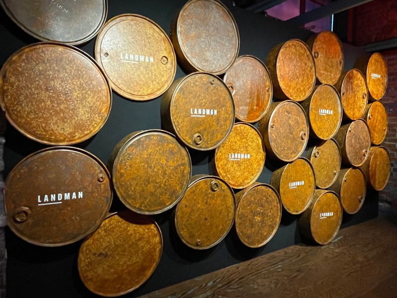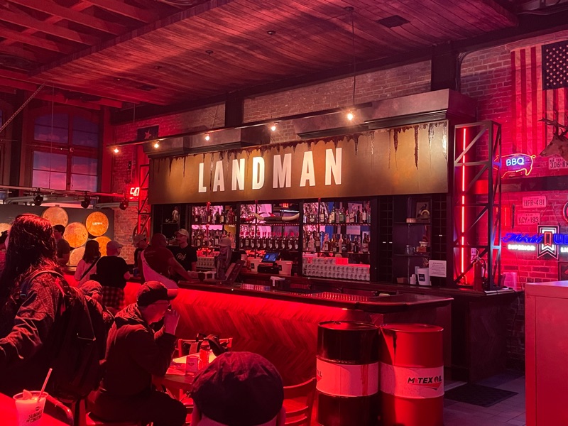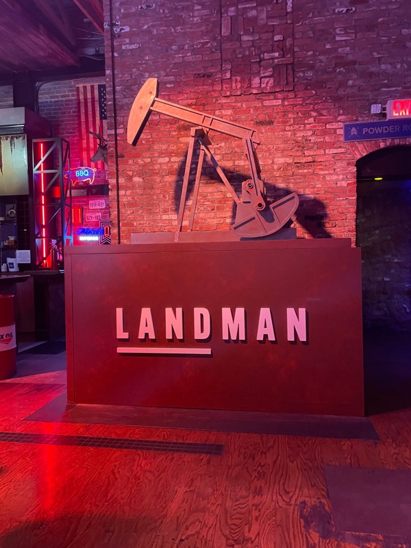 Landman had a Oil pump and Landman branded Oil drums. The bar served drinks in a collectible M*Tex mugs which we were able to keep and take with us. Some were lucky enough to snag a leather Landman coaster which we did not score. They had seating areas and tables. There were servers walking throughout The Lodge serving burgers, chicken sandwiches and fries. The theming was on point. See our pics below: