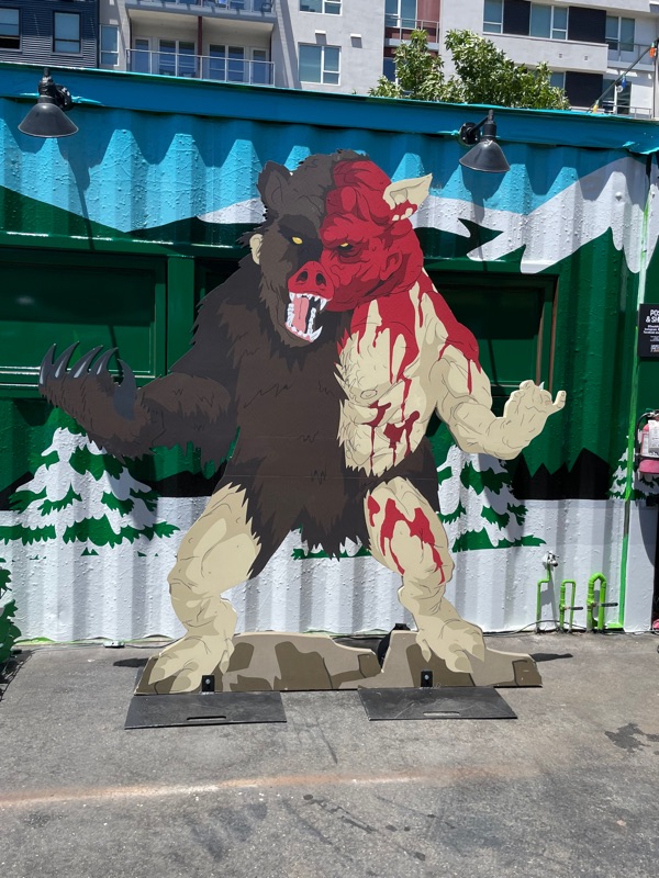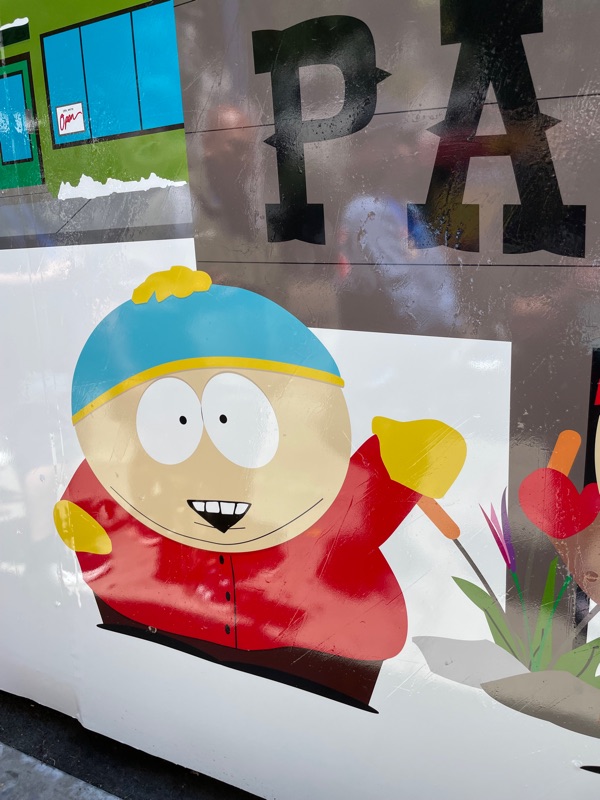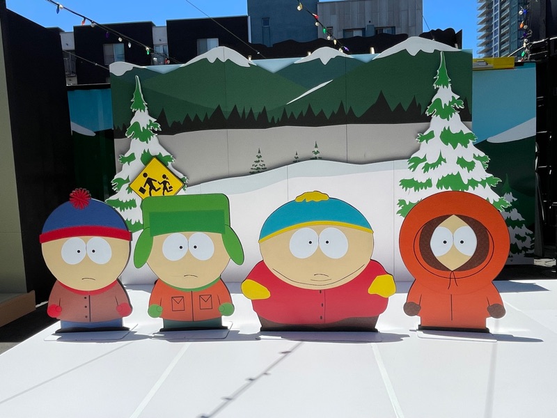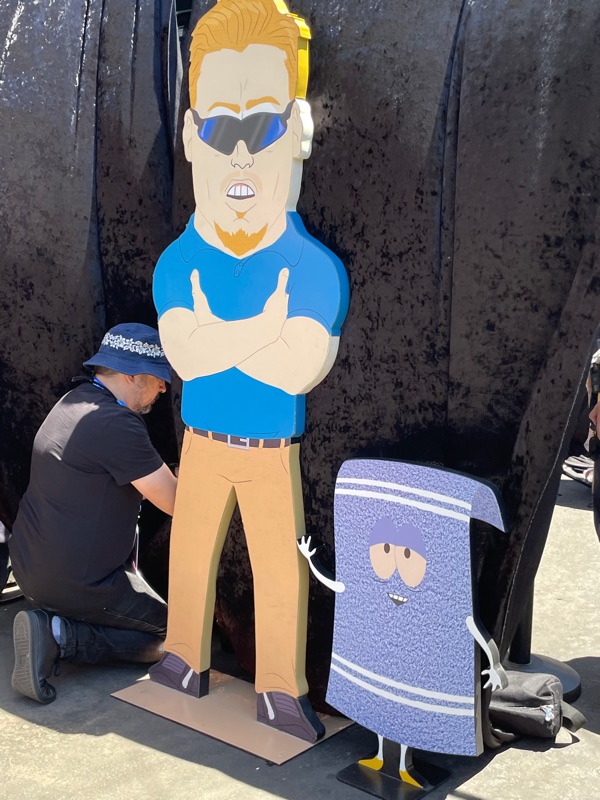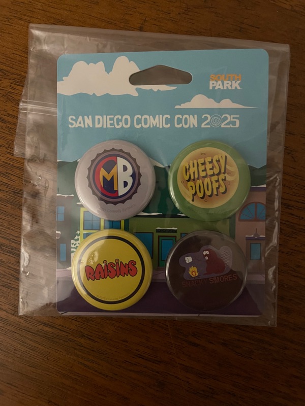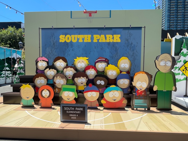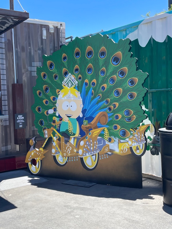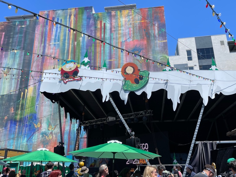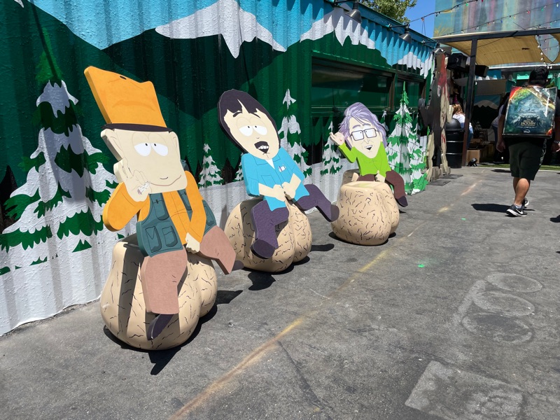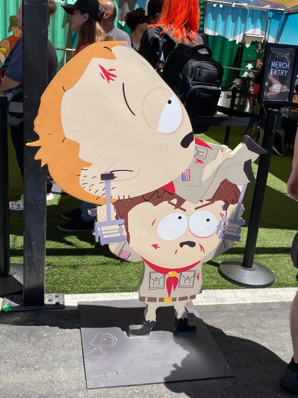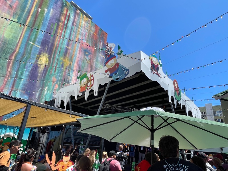 South Park had their offsite activation pretty far away from everyone else this year. They had a ticketed RSVP line and stand by line. The tickets went as quick as they were released. They were pretty strict on the food/drink policy and that we couldn’t bring in any opened drinks or food including snacks. Kinda absurd to make people throw their stuff away. We get that they wanted us to buy their food, drinks and merch but that’s asking for too much. We were there to experience their activation. They had some cool theming inside and a few photo ops. They had a stage that showed clips from the show. They also had a South Park Trivia contest. Not sure how people were picked for it. On our way out from the activation they gave us button packs. It was an okay activation but not worth waiting in line for.