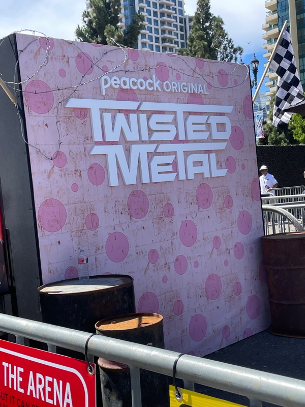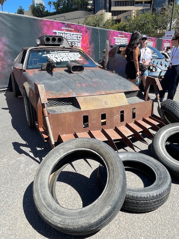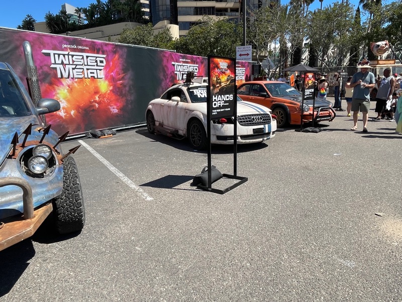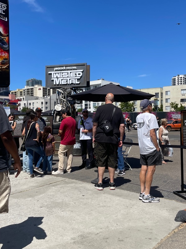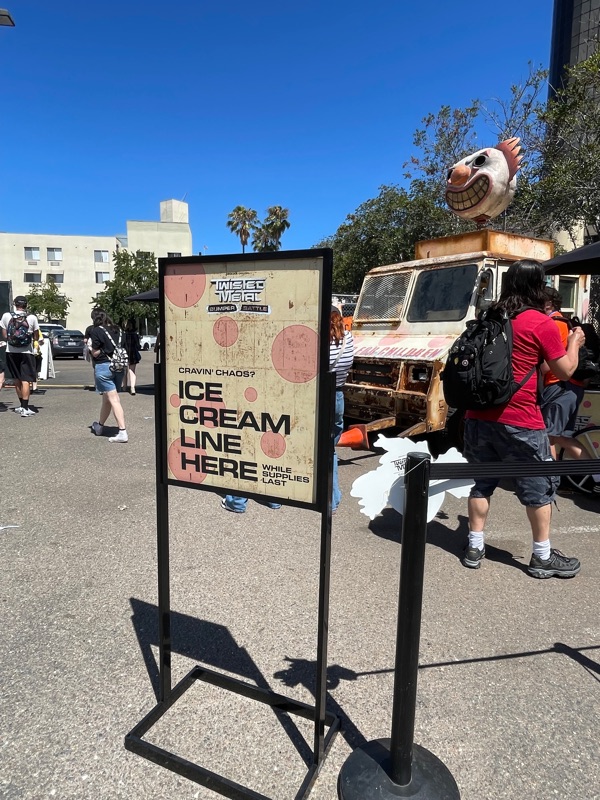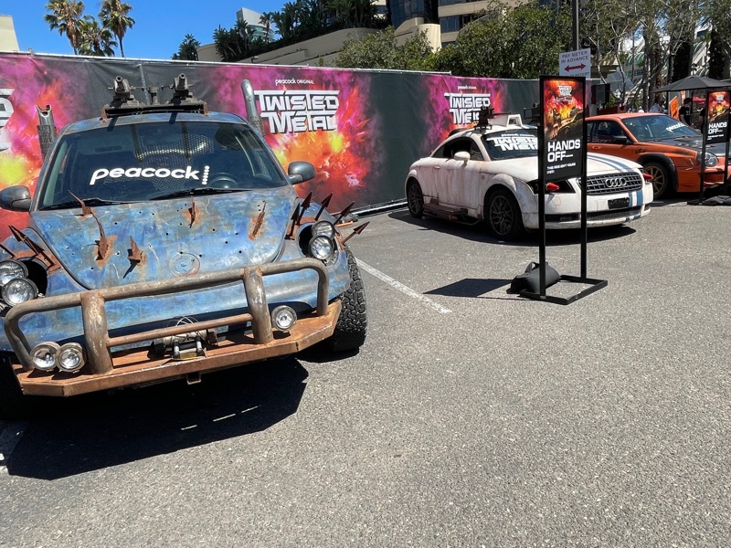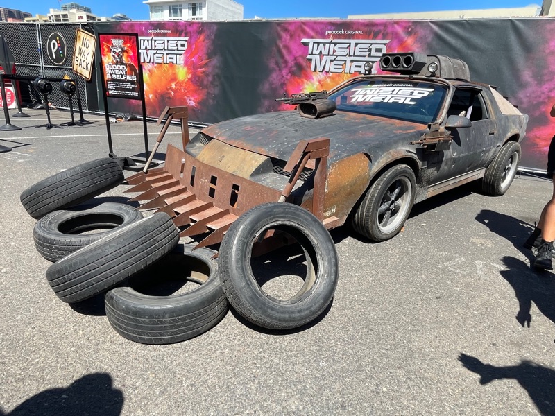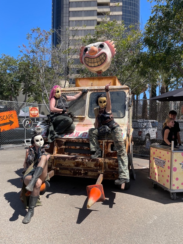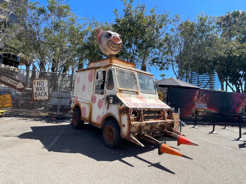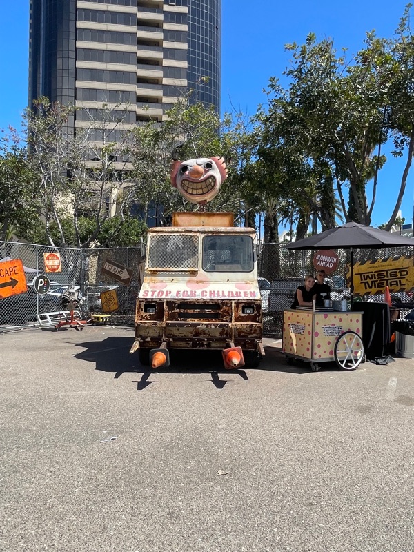 We checked out the Twisted Metal Bumper Battle Activation during SDCC. You had to be 18+ to participate in the Bumper Battle and also had to sign a waiver. The standby line moved fairly quickly. Once you get inside there were photo ops featuring some of the cars and vehicles from the show as well as the Twisted Metal ice cream truck which meant free ice cream. They also handed out free masks and posters. Check out the pictures below: