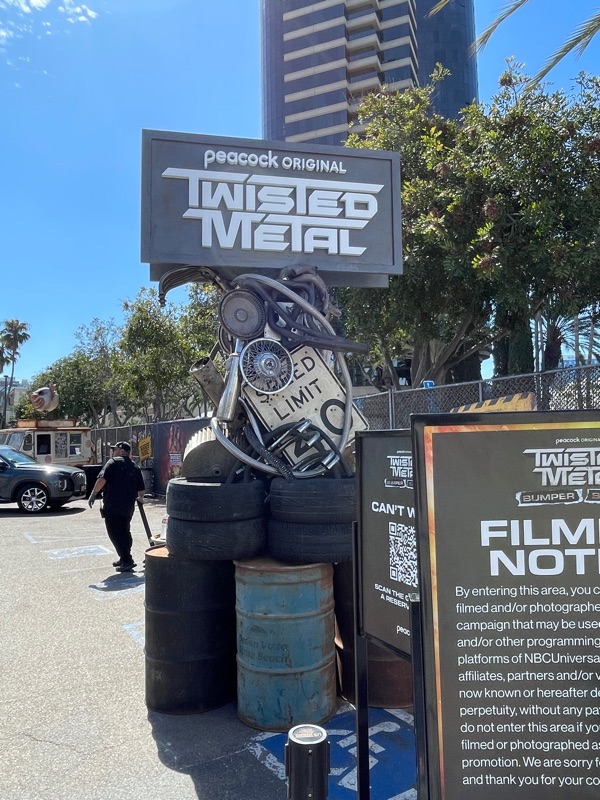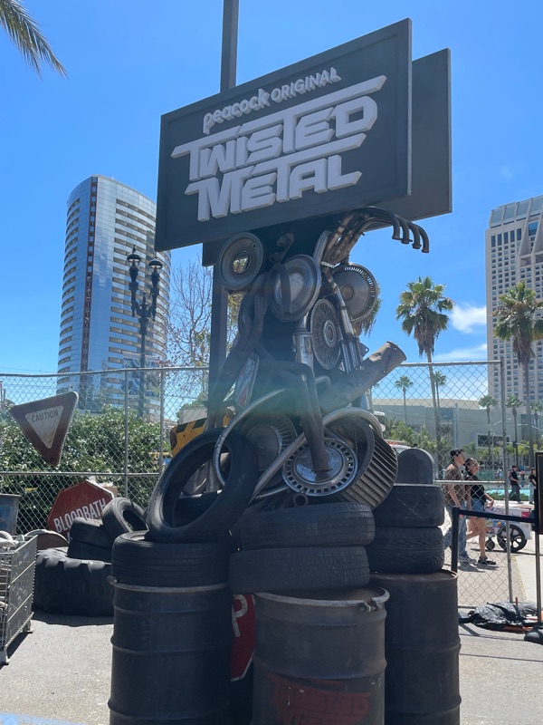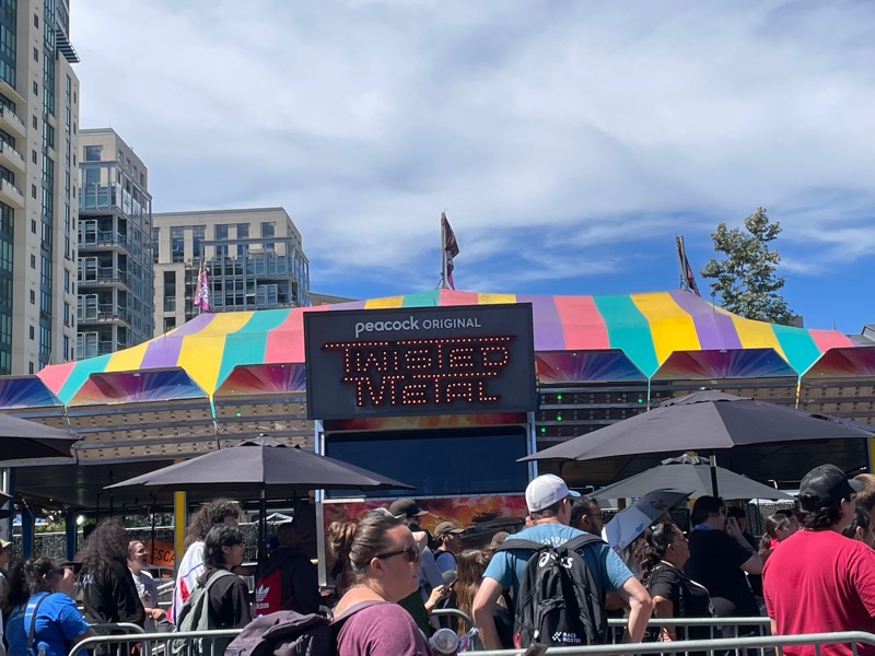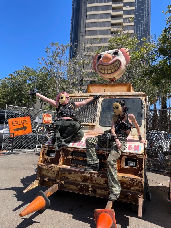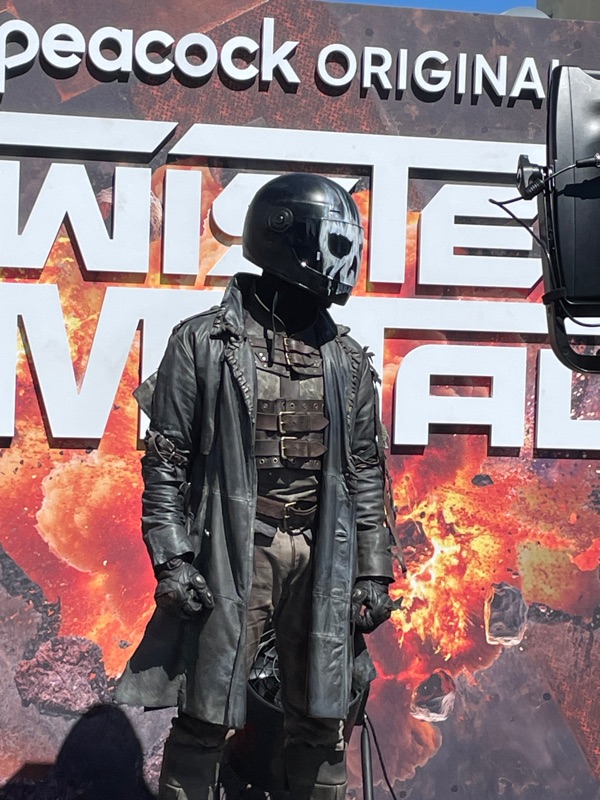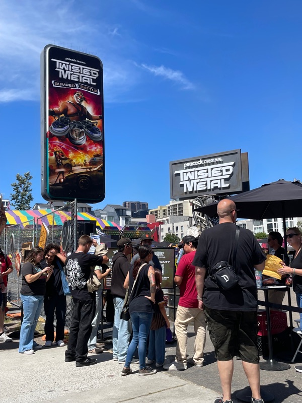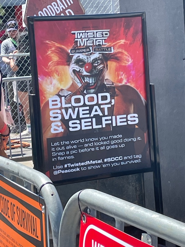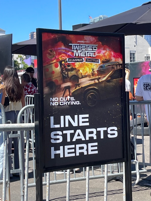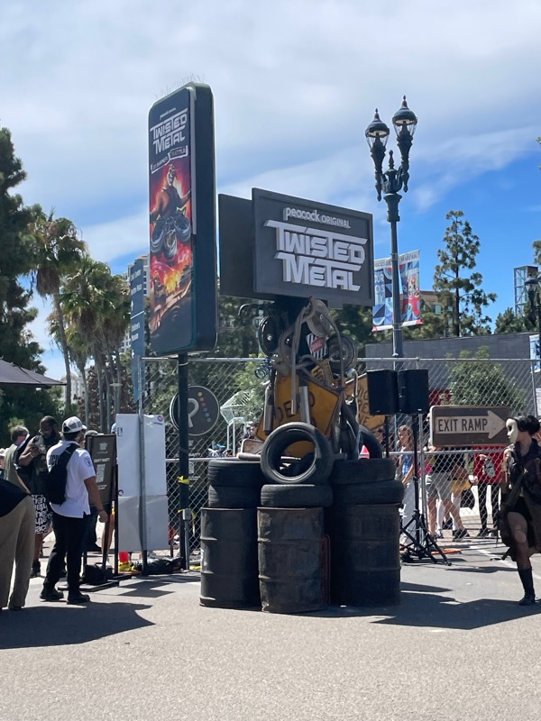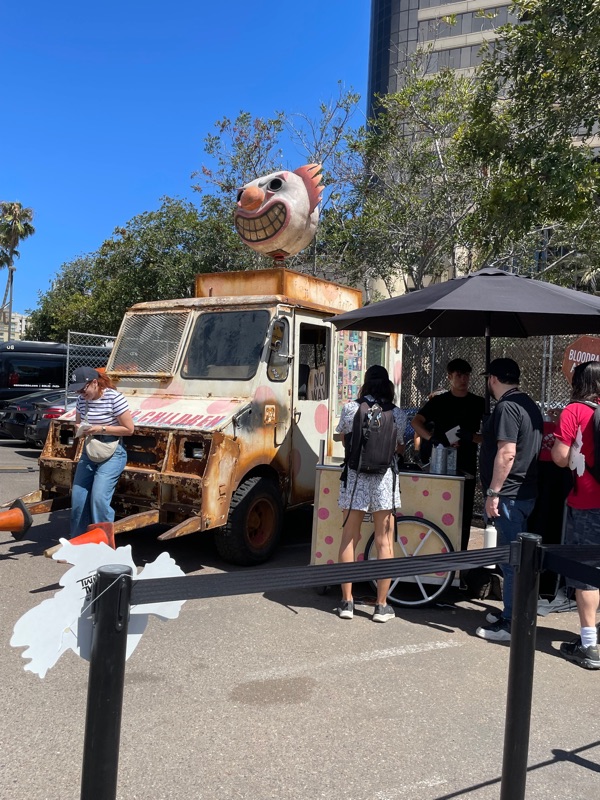 We checked out the Twisted Metal Bumper Battle Activation during SDCC. You had to be 18+ to participate in the Bumper Battle and also had to sign a waiver. The standby line moved fairly quickly. Once you get inside there were photo ops featuring some of the cars and vehicles from the show as well as the Twisted Metal ice cream truck which meant free ice cream. They also handed out free masks and posters. Check out the pictures below: